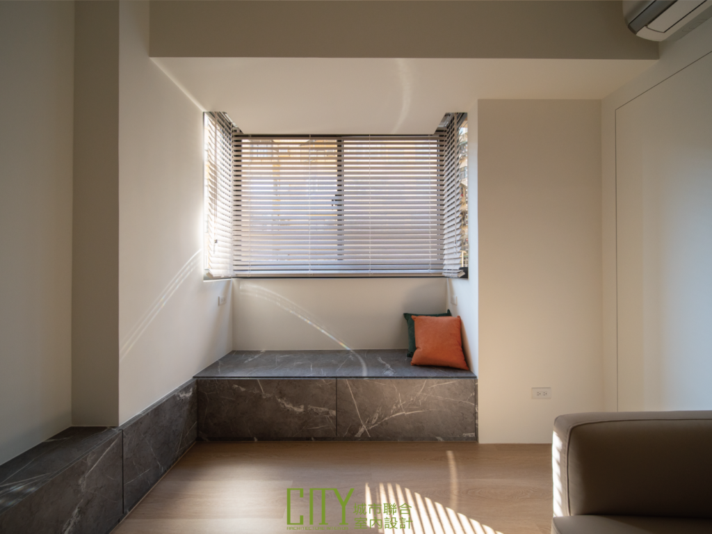 在公領域中,將電視櫃以系統板俐落延伸至窗